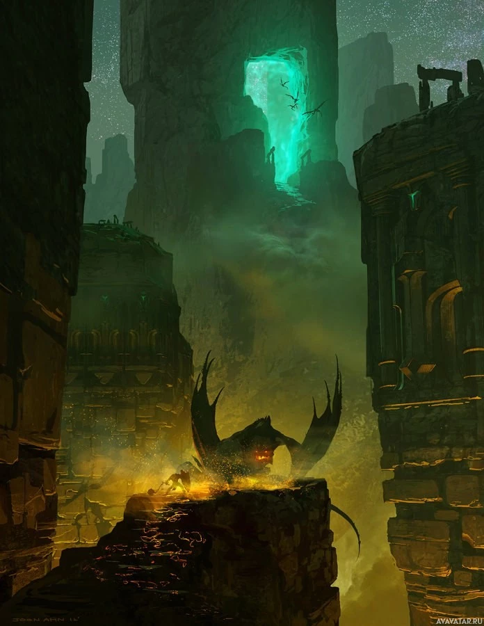 rocky landscape with towering structures that resemble ruins or ancient architecture. There is an ethereal glow around the central area of the image, which adds to