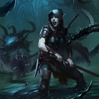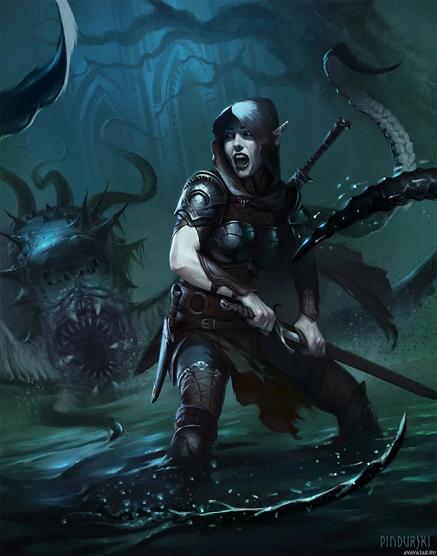 a fantasy scene with a character who appears to be an adventurer or warrior, equipped with armor and weapons such as a sword and a crossbow. She is wearing a hood that partially obscures her face, which suggests she might be from a species or race known as "drow," commonly associated with dark elves in