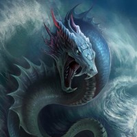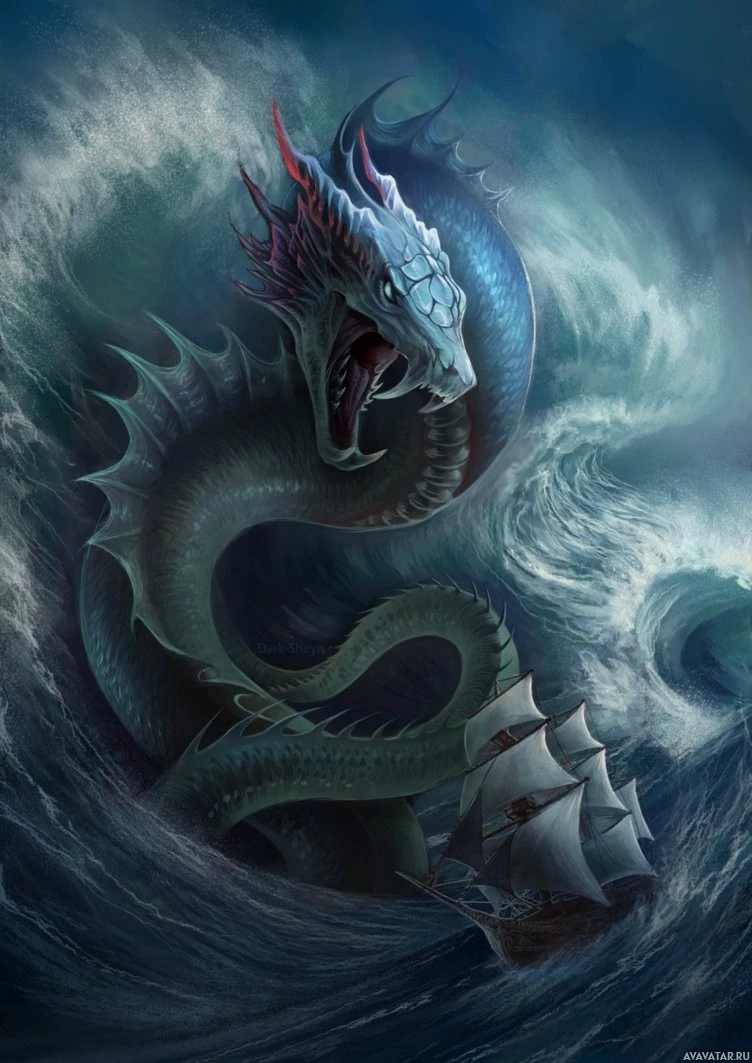 a fantastical scene with a dragon or serpent-like creature, likely of mythological or fantasy origin, in the middle of a large, turbulent body of water that resembles an ocean. The dragon has