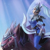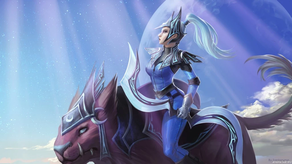 the video game "Dota 2" named Luna. She is depicted as a warrior riding on the back of what appears to be a mythical or magical creature, possibly a unicorn or griffin, given its lion-like head and wings. The setting includes a mystical landscape with stylized clouds and a celestial backdrop that gives off an otherworldly vibe, which is typical for