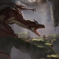 a fantastical scene, likely from a fantasy-themed game or story. There are several key elements in this image: 1. A **dragon** is the central figure, with its wings spread wide as it appears to be soaring down towards