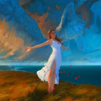 several birds and what appear to be feathers floating around her. There is an angelic quality to her presence due to the wings that seem to emerge from her back. The background features a vast landscape with rolling hills, greenery, and what could be water in the distance under