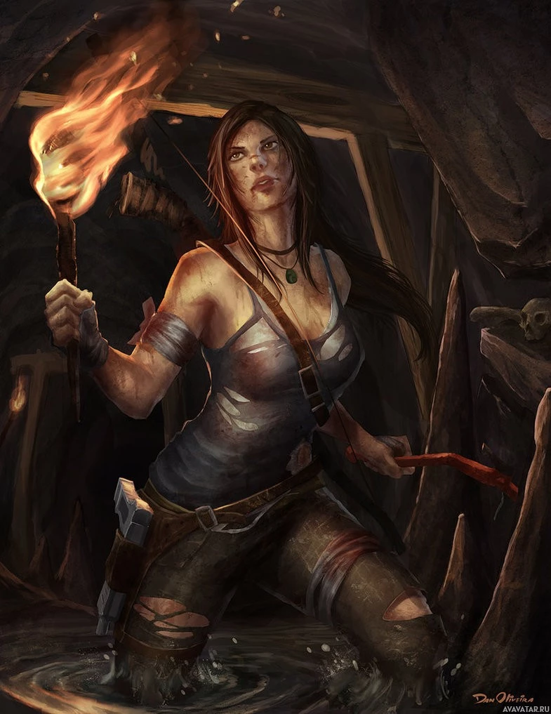 a female character who appears to be Lara Croft, a famous video game character. She is holding a torch in her right hand and is surrounded by what looks like