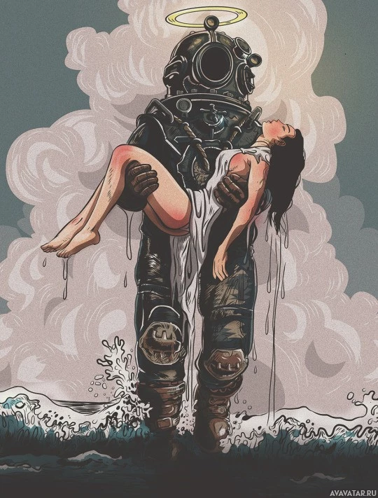 long hair and is wearing an old-fashioned dress that could suggest she's from a different era than the diving suit. The background features