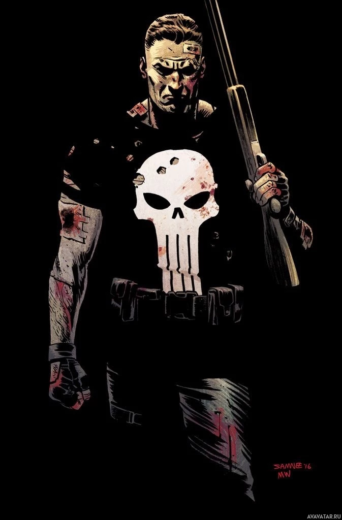 Comics universe, specifically the Punisher, who is known for his use of weapons and skull-like imagery. He is depicted holding a gun, which aligns with his role as a vigilante and antihero that operates in a grey moral area. The image includes his