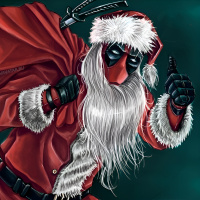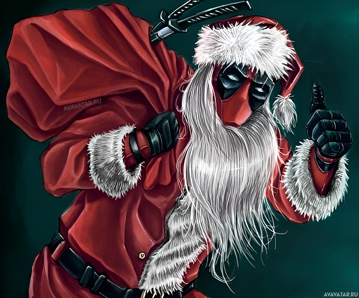 an illustrated character who is a combination of Deadpool and Santa Claus. Deadpool is known for his red and black costume with the Deadpool logo, and Santa Claus is associated with traditional holiday attire, including