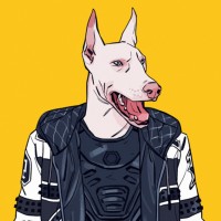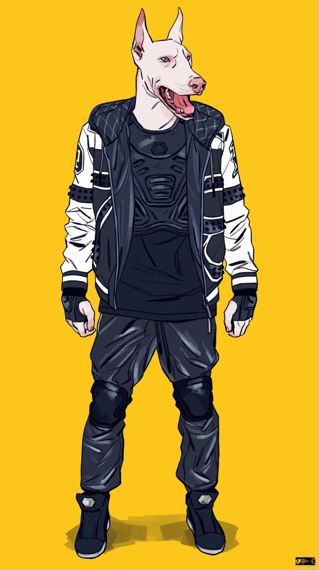 На картинке изображен иллюстрированный персонаж, одетый в куртку с принтом животного и собачьими ушами, выступающими из верхней части головы. Стиль произведения предполагает, что оно может быть вдохновлено уличной модой, а персонаж имеет уверенную позу с руками в карманах или на бедрах. Здесь нет настоящих животных, это стилизованная иллюстрация, которая сочетает в себе человеческие черты с элементами животных.