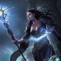 The image depicts a fantasy-themed illustration of an elf wielding magic. The character is standing amidst what appears to be