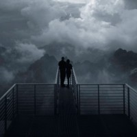 silhouetted figures standing at the edge of a high platform with a railing, overlooking a dramatic and stormy landscape. The sky is filled with
