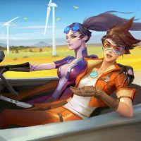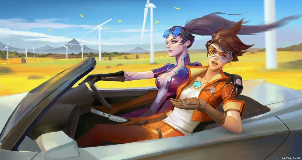 the video game "Overwatch" inside a futuristic car. On the left side of the vehicle is Tracer, and on the right is Widowmaker. They are both wearing their respective character skins and appear to be engaged in driving or racing, given