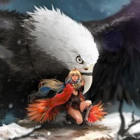 a fantasy scene featuring a blonde girl, who appears to be in a battle with a large bird that resembles an eagle. The setting looks like a wintry environment with