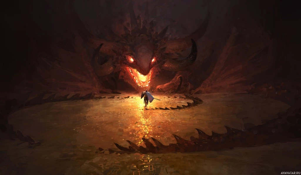 a fierce pose, possibly guarding a treasure or something of value that's on the ground between its legs. A humanoid character, perhaps a hero or adventurer, stands before the dragon with