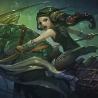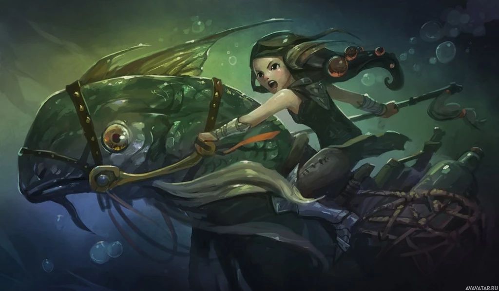 a fantasy character riding on the back of a giant fish or aquatic creature. The character appears to be female, wearing armor and holding a staff. She has a determined look on her face as she seems to be navigating through water and possibly