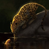 reflection in the water. In the foreground, there is an animal that appears to be drinking or interacting with the water. The background features