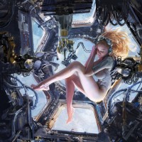 the cockpit of a spaceship or spacecraft, given the controls and instrument panel surrounding her. Her pose suggests she might be pretending to pilot the craft. The setting gives an impression of