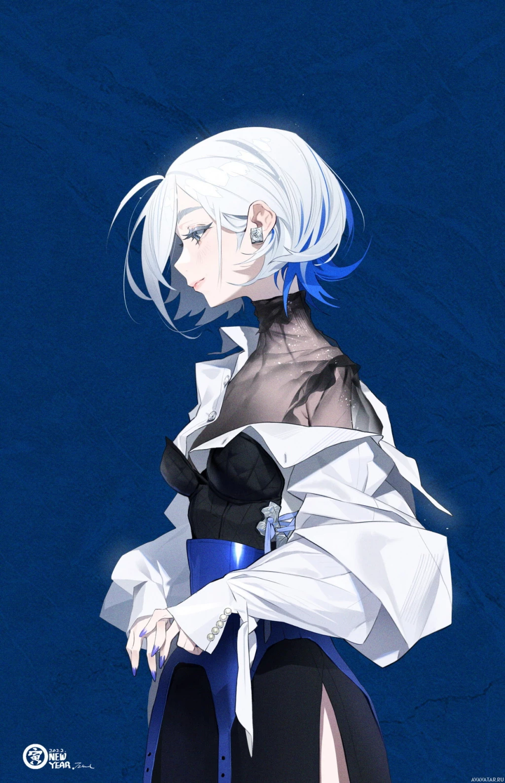 На картинке изображен анимированный персонаж с белыми волосами, одетый в черно-белый наряд. У нее есть созерцательное выражение на лице, и работа выполнена в детальном стиле иллюстрации, который предполагает, что она может быть из серии аниме или манги.