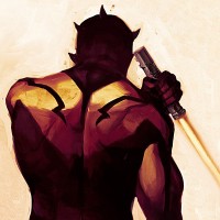 The image depicts a character known as Darth Maul from the "Star Wars" franchise. He is shown from behind, holding what appears to be a lightsaber in each hand. His attire and backdrop give off a dramatic and intense vibe that is characteristic of his role in the movies.