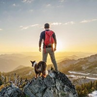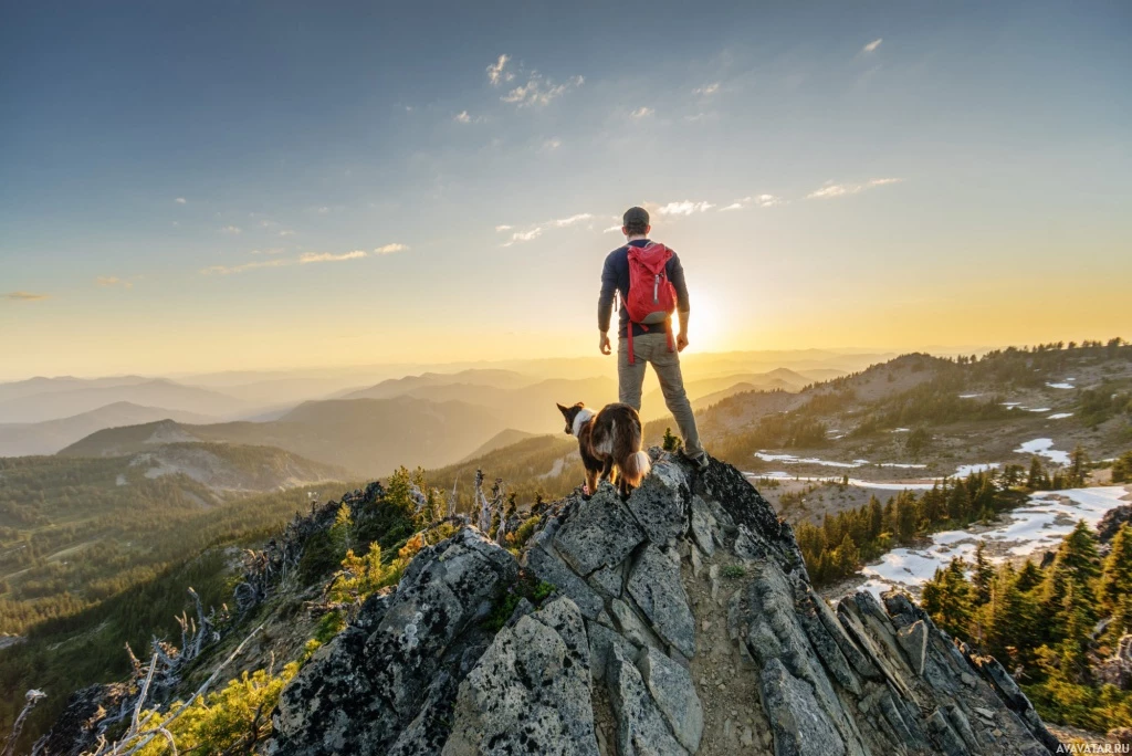 high spirits. To his side, there's a dog that seems to be accompanying him on this hike. The background reveals a beautiful