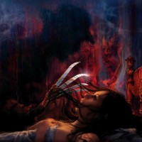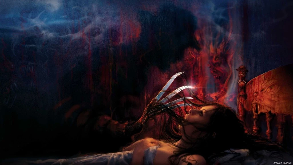Freddy Krueger from the "Nightmare on Elm Street" series, recognizable by his distinctive red and black glove and menacing expression. The lighting is subdued with