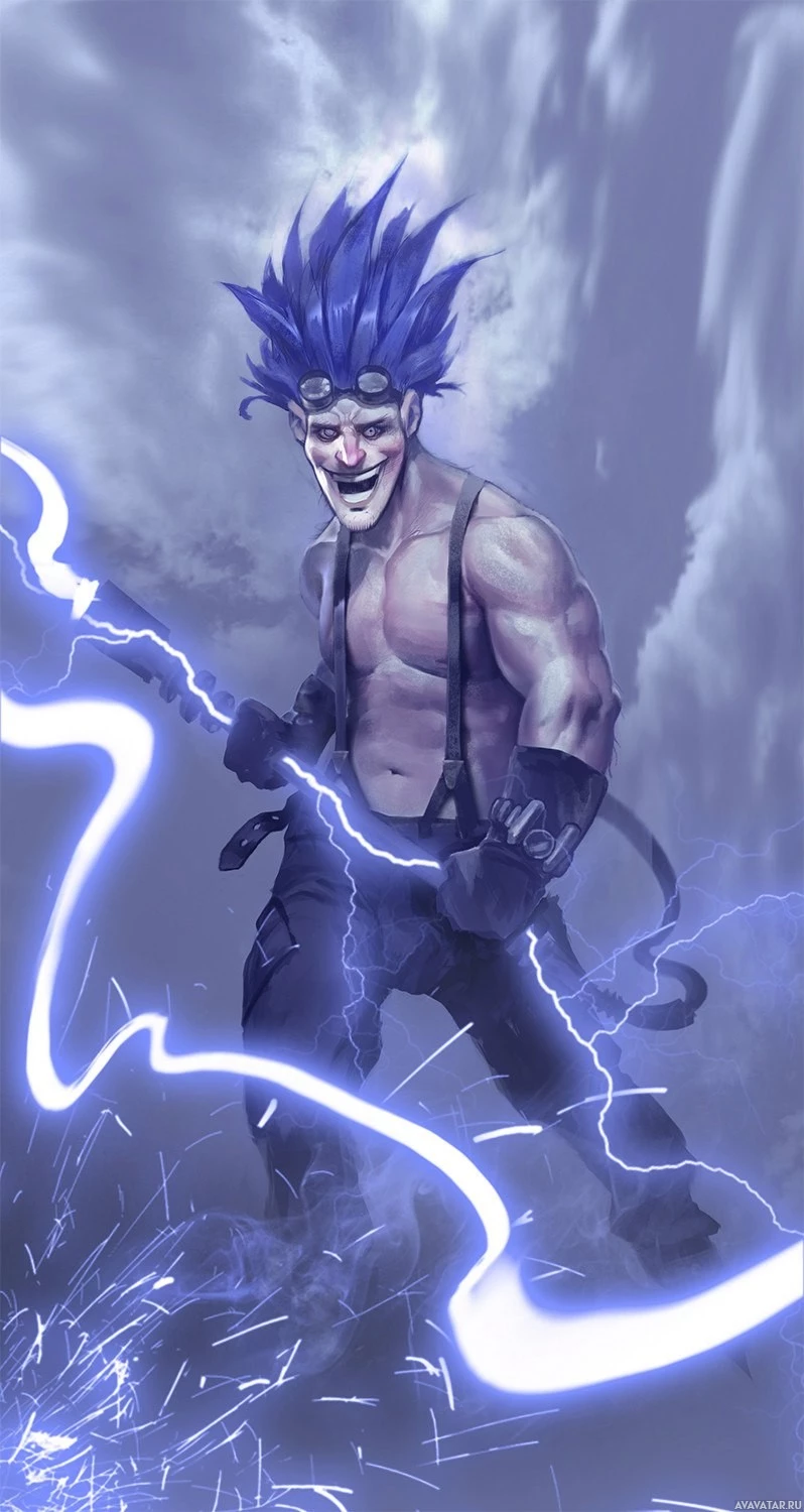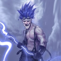 animated character with an exaggerated and fantastical appearance. The character is depicted as a muscular man with blue skin, wearing a black top, and having spiky