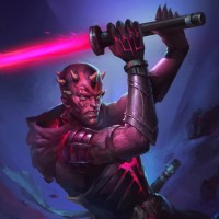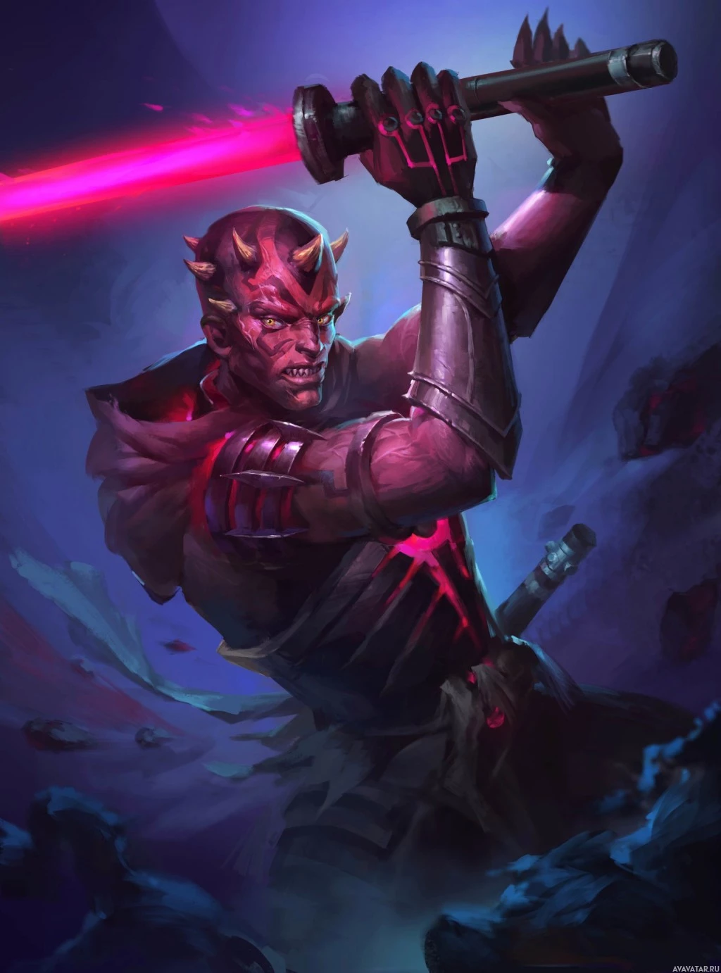 The image shows a stylized artwork of a character reminiscent of Darth Maul from