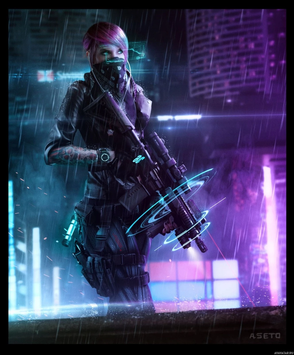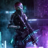 neon lights, suggesting that this scene could be taking place in a futuristic cityscape or a heavily industrialized area during nighttime or under poor visibility conditions due to the rain or fog. The character's attire and gear suggest she is well-prepared for combat or
