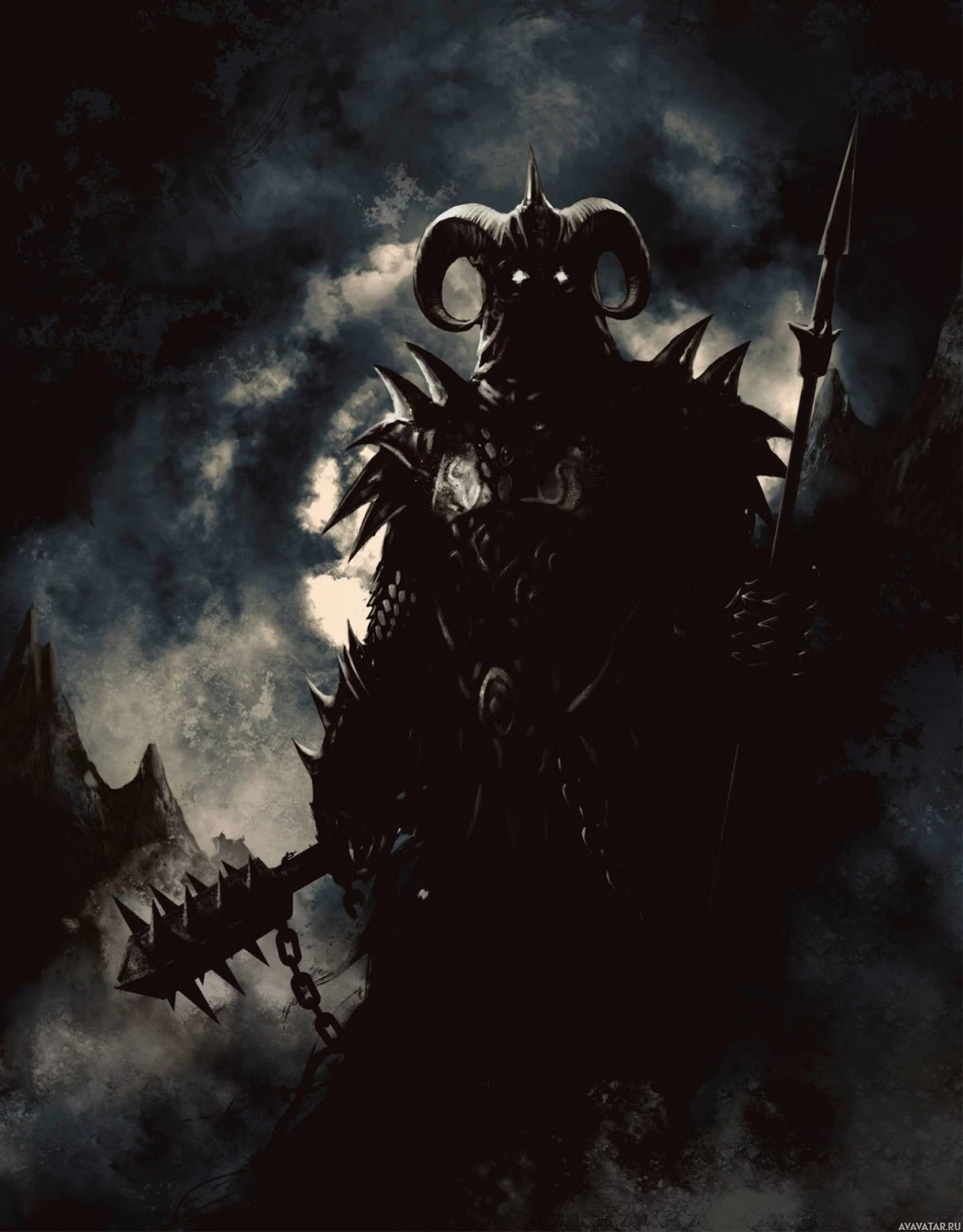 an ominous atmosphere. They are wearing armor that includes spikes and what appears to be horns on their helmet, which suggests a menacing or evil presence. The character also holds a sword, adding to the warlike or battle-ready impression. The overall mood of the image is one of mystery and danger.