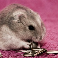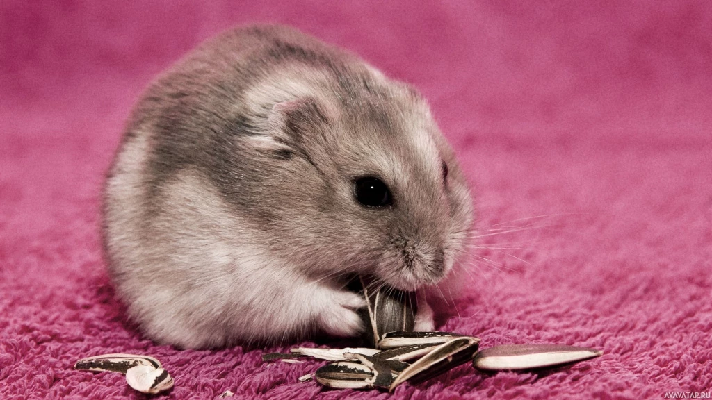 На картинке изображен маленький хомяк, сидящий на розовой поверхности. Похоже, что он ест или взаимодействует с некоторыми семенами, возможно, семенами подсолнечника, которые разбросаны вокруг него. Хомяк имеет пушистое пальто и ориентирован на еду.