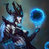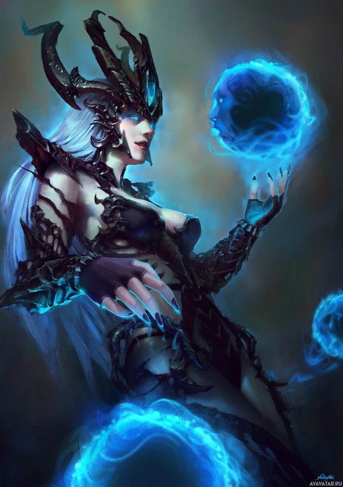 blue eyes, and they are holding out their hands towards a floating orb that emits a glowing blue energy. The setting has an ethereal quality, with