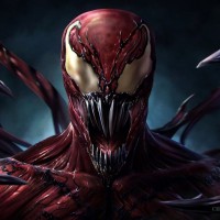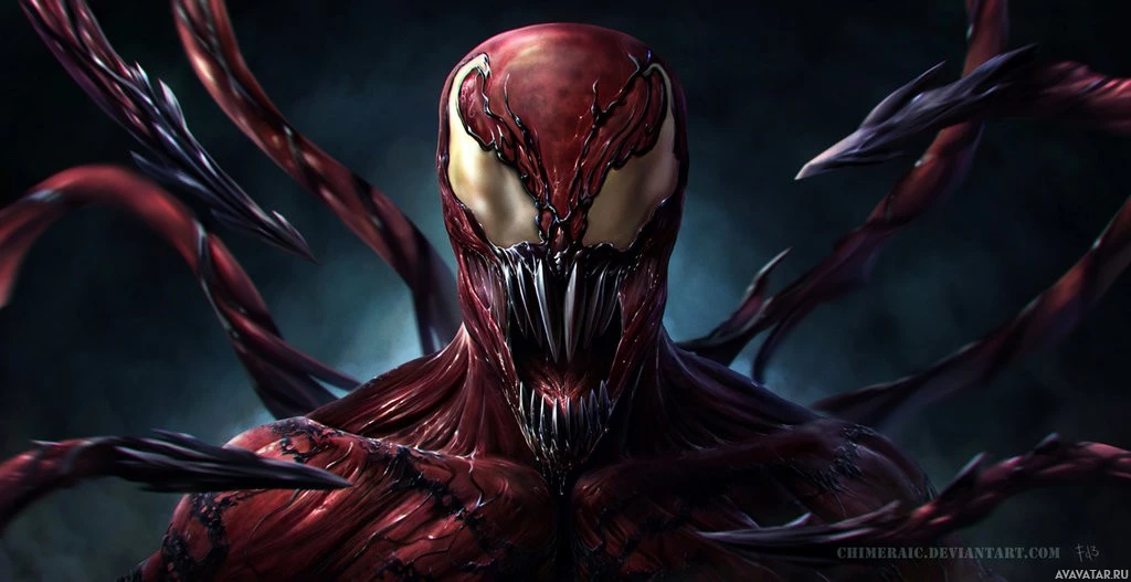 a dynamic pose, with his signature red and black suit, and multiple tendrils extending from his back, which is characteristic of the symbiote form he often takes on. The background has a dark and ominous feel to it, enhancing the villainous
