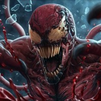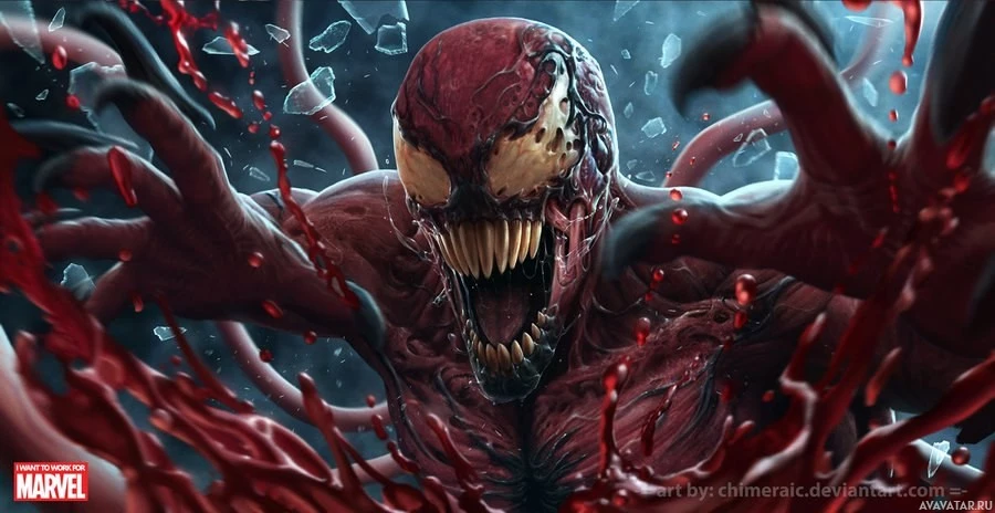 book cover or movie still. It's worth noting that Carnage is often associated with Spider-Man characters due to his origins and connections, but this is more of an image based on
