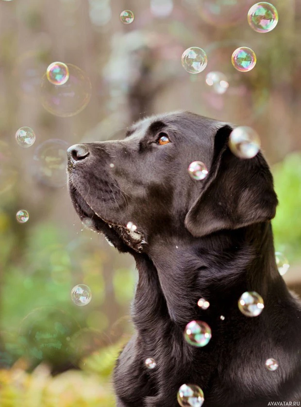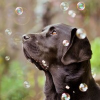 multiple bubbles floating around in the air. This creates an atmosphere of playfulness and joy associated with the dog's appearance. The dog is likely enjoying its time outdoors or participating in a game involving bubbles.