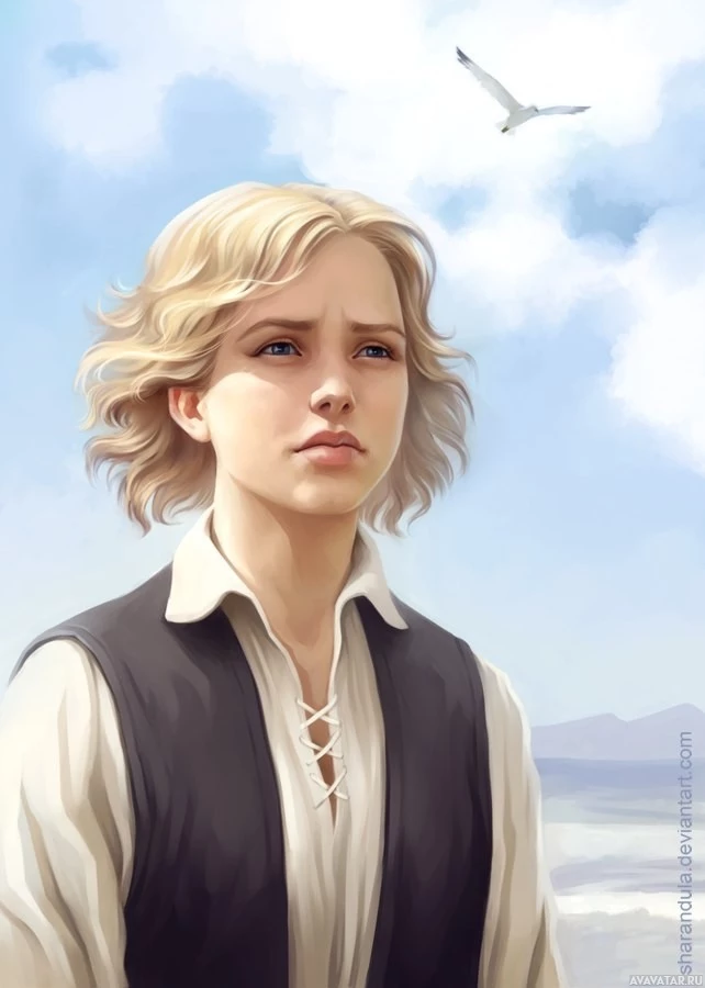 blonde hair. She is wearing what seems to be a pirate-style outfit, complete with a vest and trousers. A seagull is visible in the background, suggesting she may be near the ocean or on a ship. The overall tone of the image is somewhat contemplative or sad, as indicated by her