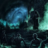 The image depicts a fantasy or horror-themed scene. At the center, there is an individual dressed in what appears to be
