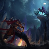 a full moon in the background, suggesting that it might be taking place at night. There are also signs of fire nearby, adding to