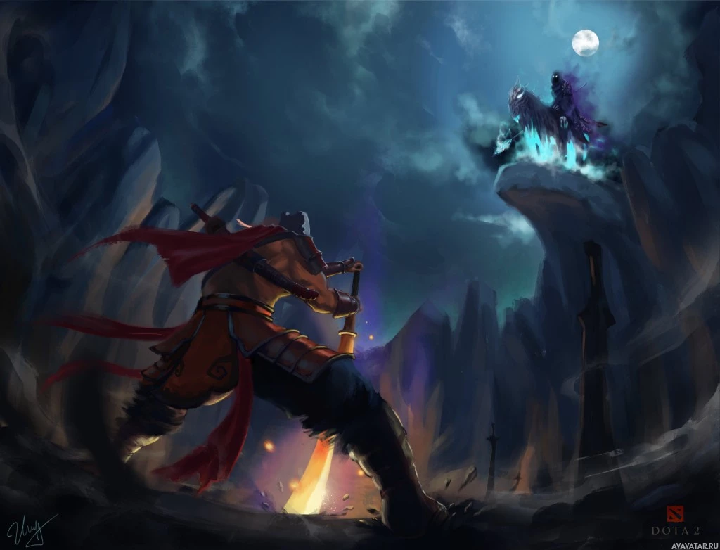 a character from the game Dota 2 named Juggernaut. He is depicted in an intense