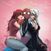 a female character known for her cunning and often being involved with Spider-Man in various adventures. All three characters are shown in a friendly interaction, with Peter Parker seemingly kissing Mary Jane on the cheek while