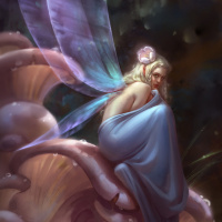 The image features a fantasy-themed illustration of a woman with fairy-like characteristics. She has wings and is dressed in attire that suggests an ethereal or magical nature, possibly inspired by elfin or nymph-like mythologies. She is sitting on