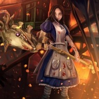 an animated character resembling Alice from the original "Alice in Wonderland" story, but with a darker and more fantastical twist. She is shown wielding what appears to be a weapon or staff and is surrounded by chaotic elements such as fire and debris. There are also characters that look like the Cheshire Cat and possibly other whimsical creatures in the background, which adds to