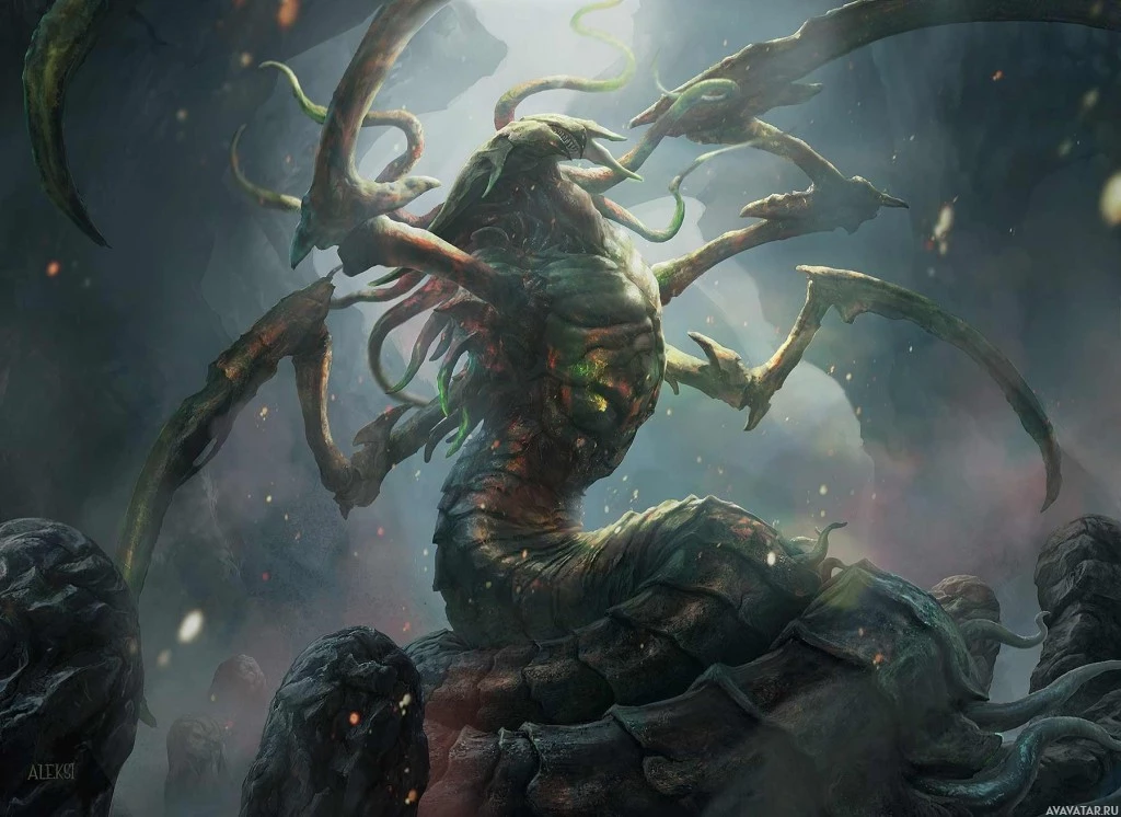 multiple heads, each with its own set of eyes, suggesting a supernatural or mythical origin. It also features tentacles that add to the monstrous appearance. The overall atmosphere is ominous and otherworldly, fitting within the genre of fantasy artwork where