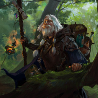 a forest setting, which includes various trees and foliage surrounding him. The character is wearing what seems to be ancient or medieval clothing, suggesting he may be from a fantasy-themed narrative. He holds a staff in his right hand and is gazing into the distance with