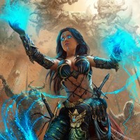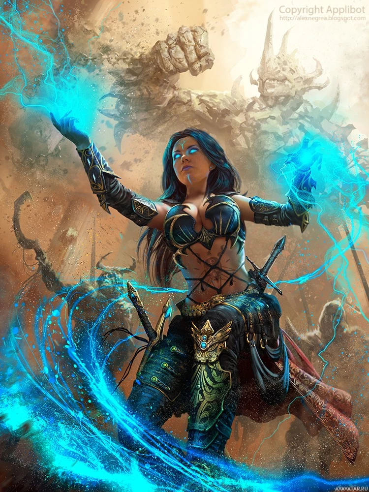 a female character in a fantasy setting. She is wearing armor and holding what appears to be magical energy or electricity around her hands. In the background, there are
