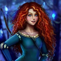 shaped brooch, indicating her skill in archery. The background shows a forest at night, enhancing