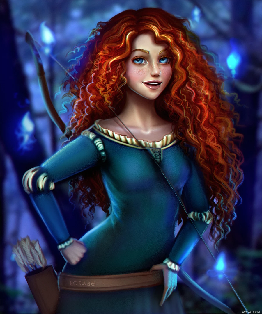 a blue dress that has a medieval style design, suggesting she might be from a period setting. In her left hand, she holds an arrow-