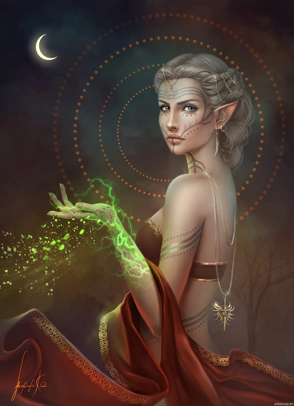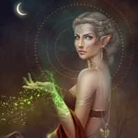 a noble lineage or is a practitioner of some form of magic. The background has a mystical ambiance with swirling patterns and a crescent moon in the sky, which complements the overall