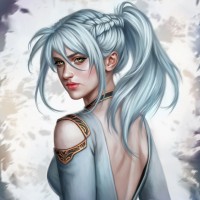 a blonde hairstyle with a braid on one side and is wearing what appears to be armor with an ornate emblem on the shoulder. Her expression is serious, and she's looking off to her side rather than directly at the viewer. The background suggests a magical or fantastical setting, possibly a forest or a mystical place given