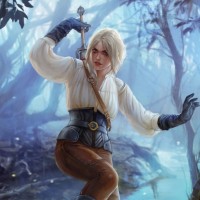 a tree branch, dressed in fantasy-style attire that includes boots and armor. Her pose suggests she might be performing an action or casting a spell. The background features misty trees and