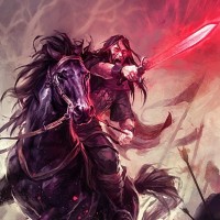 The image features a warrior on horseback. The rider is wielding a sword and appears to be engaged in combat or battle. The background suggests a tumultuous environment, possibly indicating conflict or battlefield conditions. The style of the image is artistic with a dramatic composition that conveys action and intensity.