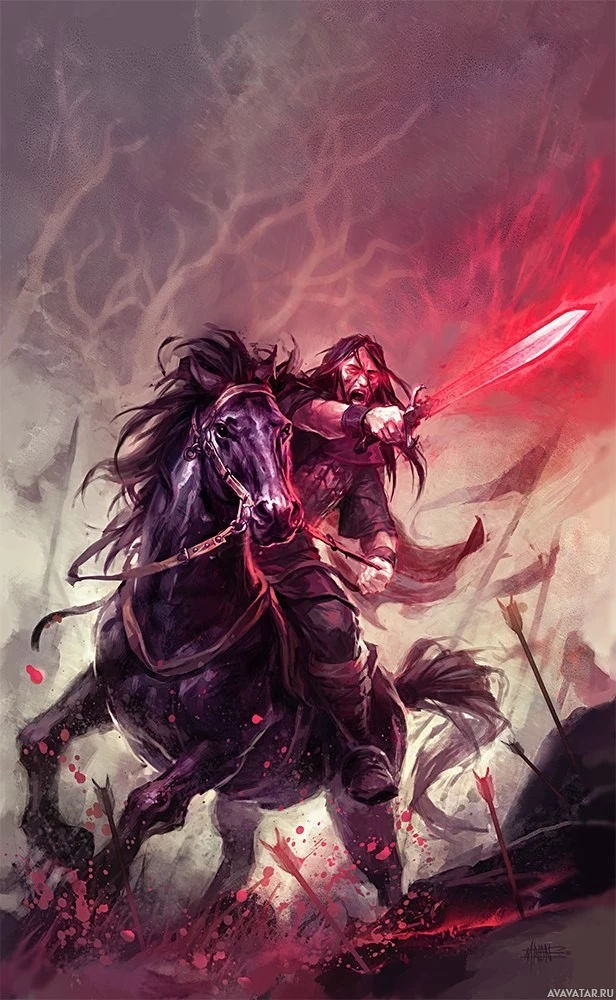 На картинке изображен воин на лошади. Всадник владеет мечом и, кажется, участвует в бою или сражении. Фон предполагает бурную обстановку, возможно, указывающую на конфликт или условия на поле боя. Стиль изображения художественный с драматической композицией, передающей действие и интенсивность.