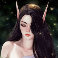 flowing hair and her eyes are closed, giving the impression that she is peaceful or perhaps dreaming. The background suggests a forest-like environment with what appears to be starlight, adding to the ethereal quality of the image.